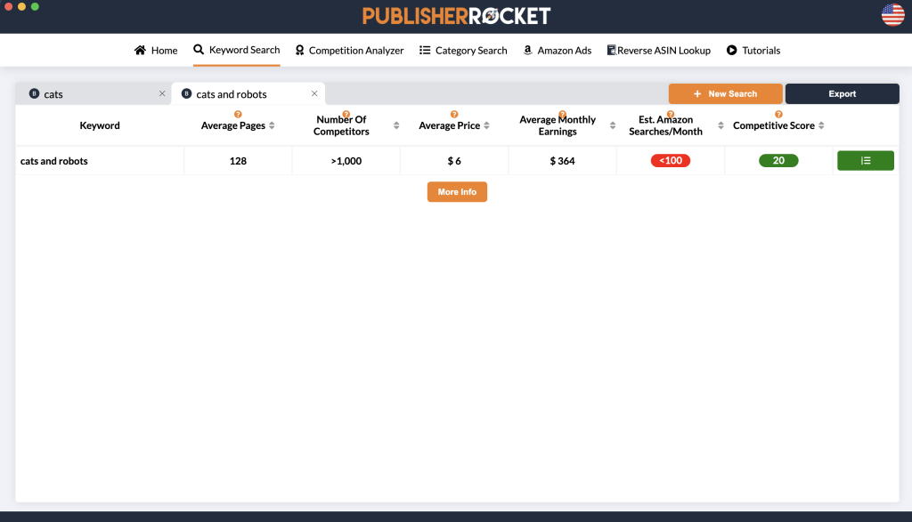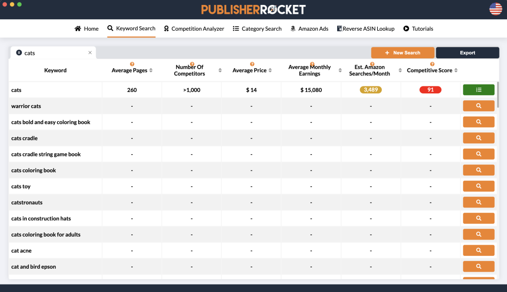 Publisher Rocket keywords turns hours into seconds. And that’s no joke. Just head over to their Amazon Keyword Search function and–Voila! You are on your way. And it can also help you find just the right niche to start writing your next book!