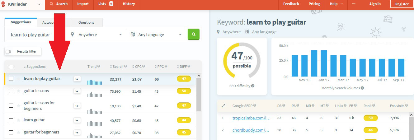 As we can see from the above image, ‘learn to play guitar’ is a more popular search topic than ‘guitar lessons for beginners’. If you were thinking about writing a book of this nature, you would already have a clearer idea of what people really want.